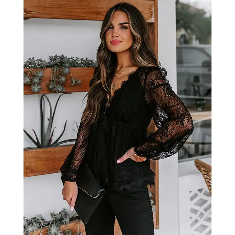 Elevate your wardrobe with this stunning Cross Border Foreign Trade Autumn and Winter Sexy Perspective V-neck Bow Long Sleeve Lace Top. Perfect for urban leisure and temperament commuting, this top combines elegance with a casual flair that is ideal for various occasions.