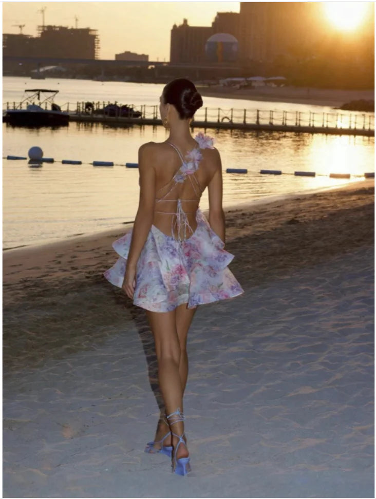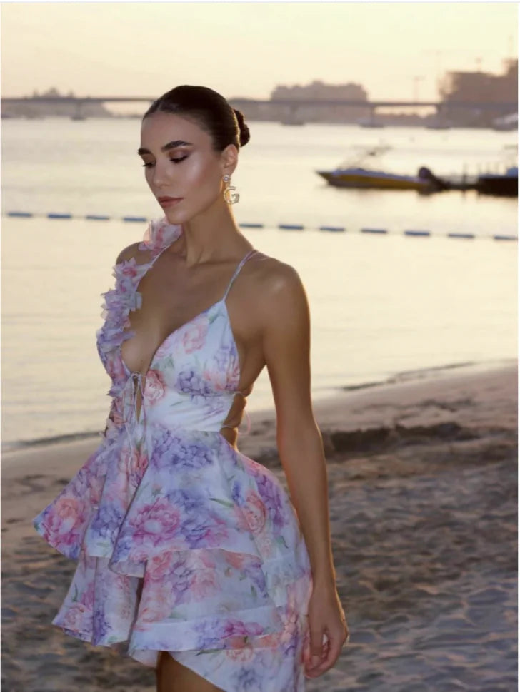 Stylish floral halter jumpsuit dress with a flattering mid-waist fit. Made from soft polyester, perfect for summer outings or casual events.