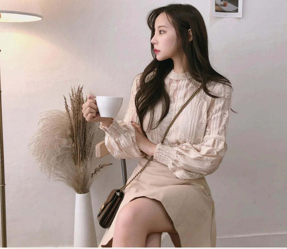 Elevate your wardrobe with our stunning Lace Top, designed to make you feel both elegant and comfortable. This beautiful lantern sleeve faux two-piece set combines the charm of delicate lace with modern styling, perfect for any occasion.